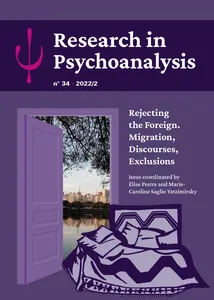 Rejecting the Foreign. Migrations, Discourses, Exclusions No 34, 2022/2 - pagesPages 1 to 8Editorial. Rejecting the Foreign. Migrations, Discourses, ExclusionsBy Élise Pestre, Marie-Caroline Saglio-YatzimirskyPages 9 to 28Immigrants and Refugees: Subjective and Territorial Displacements at the Interface between Desire and PoliticsBy Miriam Debieux RosaPages 29 to 46Refusing the Stranger: Migration, Discourse, and Exclusion in Neoliberal SubjectivityBy Davide Giannica, Gabriel Inticher Binkowski, Marie Rose Moro, translated from French by Kirsten EllerbyPages 47 to 60Borderline Experiences of Exile, from “No Place” to ShelterBy Olivier DouvillePages 61 to 79The Risks of Refusal. When Exile Becomes Wandering: Subjects in Search of a PlaceBy Maud DelahayePages 80 to 95Mapping Shadows. Bodies, Exile and ResistanceBy Eugénia VilelaPages 96 to 117Boundaries of Languages, Cultures and Papers: The Displacements Allowed by the AnalystBy Ana GebrimPages 118 to 129Interview with Michel Agier about La peur des autres, Essai sur l’indésirabilité. Conducted by Marie-Caroline Saglio-Yatzimirsky y Ana GebrimBy Michel Agier, Marie-Caroline Saglio-Yatzimirsky, Ana Gebrim